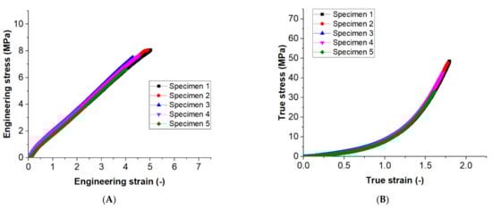 An example of (A) engineering stress-strain curves; and (B) true stress-strain curves of the combination 5 for repeatability.