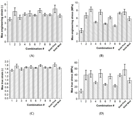 All averaged maximum values of these tensile properties are compiled in Table 2, and plotted on Figure 5A–D. These include the results of experimental matrix in the orthogonal array, and two additional cases of the 100% infilled and molded specimens. Among the combinations in the orthogonal array, the largest possible engineering strain and true strain can be found in combination 7, with a 5.03 engineering strain and a 1.80 true strain. The 100% infilled print on the other hand shows the highest value among the comparison, with a 5.3 engineering strain and a 1.84 true strain. However, the values of engineering strain and true strain of the molded specimen are smaller than many combinations, with a 4.20 engineering strain and a 1.65 true strain.