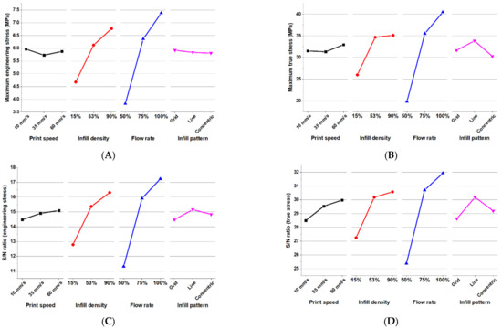 Line graphs of the effects of print parameters on the (A) maximum engineering stress in MPa; (B) maximum true stress in MPa; (C) engineering stress S/N ratio; and (D) true stress S/N ratio.