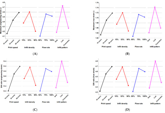 Line graphs of the effects of print parameters on the (A) maximum engineering strain; (B) maximum true strain; (C) engineering strain S/N ratio; and (D) true strain S/N ratio.