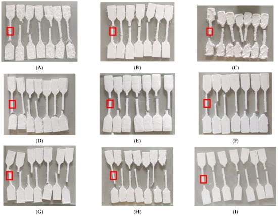 Figure 8A,F,H show holes in the structures as stated in the results. These resulting prints with low flow rate levels mean that their structures are not fused together properly, leading to the low performance of their corresponding combinations in terms of both tensile stresses seen in the graphs of Figure 5B,D. Figure 8D also exhibits holes in its structure, but this may also be due to the infill pattern not providing enough foundation for the top surface layer. In contrast, Figure 8B,C,E,G,I all show a solid top surface, which is reflected in their corresponding combinations having larger tensile stresses in the graphs of Figure 5B,D.