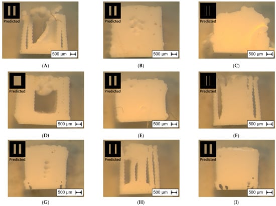 In the results, the staircase effect is mainly observed at the sides. Regarding the internal structures, Figure 9A shows a broken phenomenon and a collapsed top surface, similar to Figure 9D. Figure 9B,D,E,G,I have fused internal structures with some voids within the solid surface. In Figure 9F,H, the internal structures are shown to have vertically sliced features.