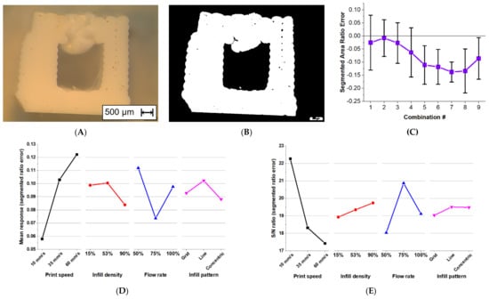 For a quantitative study of the geometric errors in printing, an example cross-section image and its resulting segmentation can be seen in Figure 10A,B, respectively. The segmented ratio error results for all combinations are shown in the line graph of Figure 10C. This graph shows that the mean values for each output are all below zero, showing that the ratio from the actual result would be smaller. The closest combination to a value of zero is combination 2, with a value of 0.008. The graphs of mean response and S/N ratio are shown in Figure 10D,E. Their S/N response values are then displayed on Table 6, where it is ranked according to their ranges.