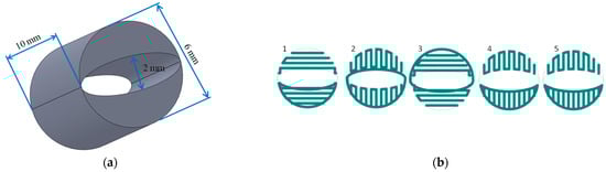 A porous cylindrical scaffold (10 × 6 mm) with an empty internal space (6 × 2 mm), was designed with SolidWorks 2012 (Waltham, MA, USA) CAD software (Figure 1a). The fiber pattern was repeated every 5 layers until 50 layers were contained in each scaffold (Figure 1b).