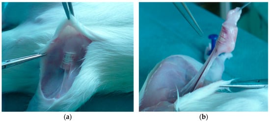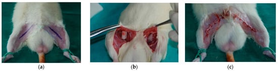 Scaffold implantation: (a) incision marking after the epilation of inguinal areas; (b) implanted scaffolds; (c) closed wound after implantation.