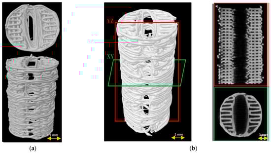 Scaffold µCT imaging: (a) 3D scaffold reconstruction; (b) µCT images of scaffold longitudinally (red frame) and cross-sectionally (green frame).
