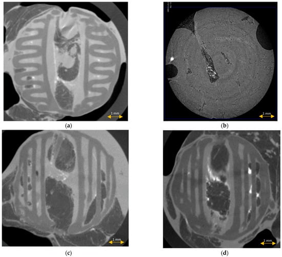 μCT imaging of the scaffolds before (a) and after the standard (b) and modified histopathological protocol ((c,d), accordingly).