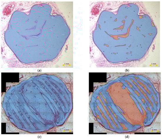 Scaffold cross-section surface (S1, blue) and soft tissue area inside the scaffold (S2, orange) on sections obtained after the standard histopathological (a,b) and modified histopathological protocols (c,d).