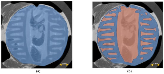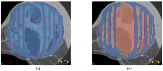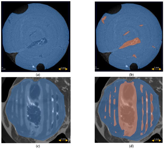 Scaffold cross-section surface (S1, blue) and soft tissue area inside the scaffold (S2, orange) on μCT images obtained before the standard histopathological (a,b) and modified histopathological protocols (c,d).