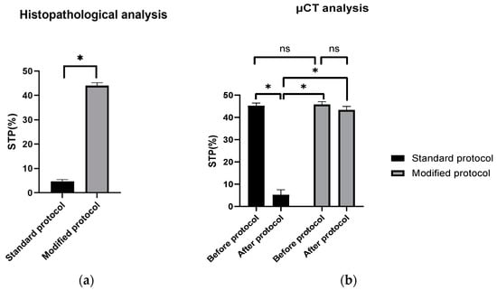 STP calculated on: (a) H–E sections after standard and modified histopathological protocols. Significant difference: p < 0.05 (*); (b) μCT images obtained before and after the standard and modified histopathological protocols. Significant difference: p < 0.05 (*), p > 0.05 (ns).