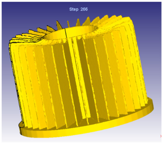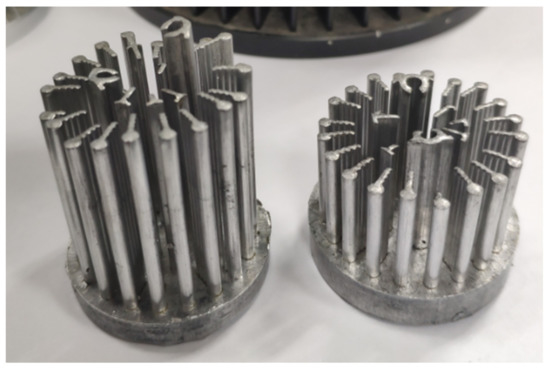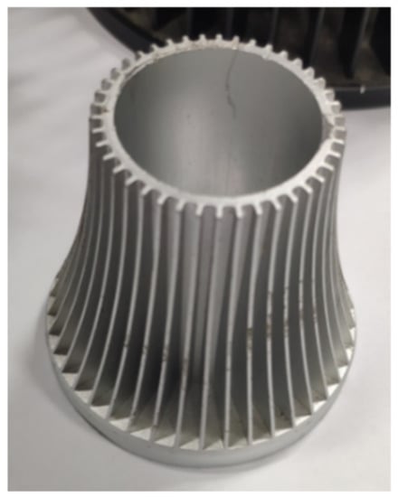Many scholars focused on the production processing and thermal performance of die cast aluminum radiators. Timelli et al. investigated the fatigue reliability of a die cast AlSi11Cu2(Fe) alloy radiator at different pressure amplitudes and thermal exposure [1,2]. Their research object are aluminum alloy heating radiators for domestic use to heat up a room. Lei et al. used investment casting and topology optimization technology to make heat sinks in order to improve the heat transfer effect, but investment casting is unsuitable for the pure aluminum LED radiators because of its low production efficiency [3]. Suresha et al. designed the casted heat sink to eliminate the air entrapping defects by means of FDM [4]. Singh et al. adopted Buckingham’s π approach in the cold chamber die casting process to control the casting defects in the die casting process [5]. The ADC12 material is usually selected for the radiator produced by die casting, but the thermal conductivity is not high at about 96.2 W/(m·K). At the same time, defects such as porosity and shrinkage are easy to appear in the production process, which reduces the heat dissipation performance. Otherwise, the radiator fin produced by this method has a large thickness and heavy product weight [6].