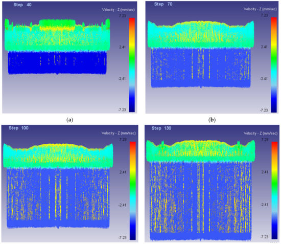Flow velocity diagram of billet along Z direction (Front view). (a) Step = 40; (b) Step = 70; (c) Step = 100; (d) Step = 130.
