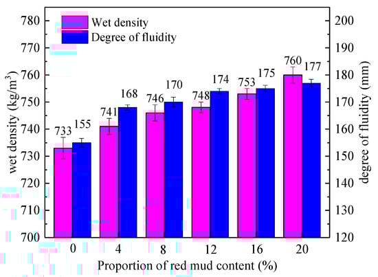 When the red mud content increased from 0% to 20%, both wet density and fluidity increased with the increase in red mud content. When the red mud content was between 4% and 20%, the fluidity of the foam light soil of red mud–bauxite tailings mud was between 168 mm and 177 mm, which meets the requirements of the specification and is conducive to filling.