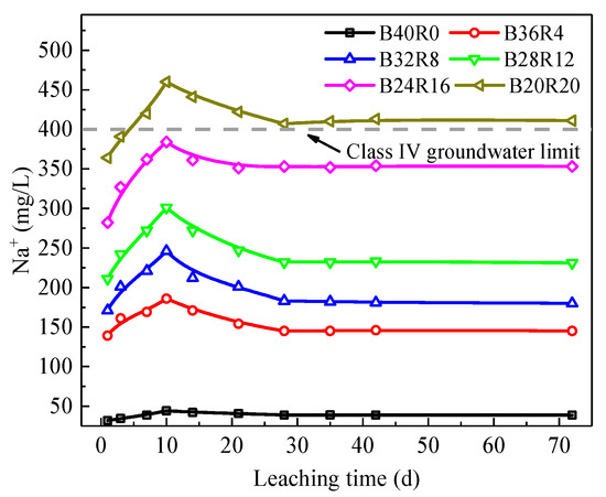 The change in Na+ leaching concentration and time is shown in Figure 9. The concentration of leached alkali in each group was roughly the same, showing a law of first increasing, then decreasing and finally becoming stable. On the one hand, the addition of red mud promoted the hydration reaction of the system, and the hydration substance generated in the system had a stable curing effect on alkali [33,34]. However, with the addition of red mud, the amount of soluble alkali introduced increased, and the leaching amount increased. According to the Chinese standard GB/T 14848-2017 [35], the maximum alkali leaching concentration was 384 mg/L for groups with a red mud content of 16%. The limit value of the four types of water in the non-supergroundwater was 400 mg/L, and the amount of alkali leaching in the B20R20 group exceeded the limit value of the four types of water. In this case, the selection of this mix ratio will have an obvious impact on the environment. Combined with UCS analysis results, the B24R16 group had the highest UCS strength, and the alkali leaching amount of this group did not exceed the four water limits, so it belongs to the best group.