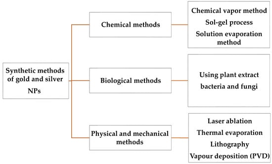 Various methods such as biological, physical and mechanical, and chemical and photochemical can be applied to synthesize Ag and Au NPs [] (Figure 1). A chemical assay reduces Ag+ to Ag0 through a reducing agent, including sodium borohydride in the existence of a stabilizer, to preserve Ag NPs from aggregating. These reducing agents could be designated cautiously to restrict environmental influence while increasing particle stability [].