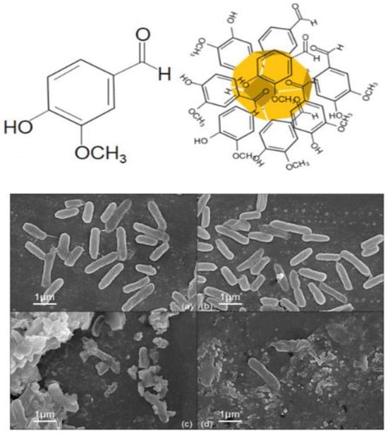 Schematic illustration of synthesized VAuNPs by vanillin (the above illustration); FESEM image of P. aeruginosa in untreated, in presence of the (a) 50 μg/mL of VAuNPs, (b) Meropenem-200 μg/mL, (c) Meropenem (20 μg/mL) and (d) VAuNPs (50 μg/mL) (the below images) []. Reprinted with permission from Elsevier.