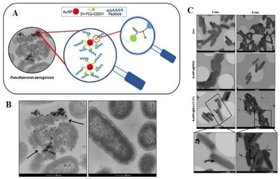 (A) Image of Esculentin-1a (1-21)-NH2 coated Au NPs and its interaction with bacteria. (B) Treatment of P. aeruginosa with (left) Au NPs@Esc(1-21) and (right) buffer as a control. (C) Schematic of P. aeruginosa cells treatment with Au NPs@Esc(1-21), Au NPs@PEG, and buffer []. Reprinted with permission from Elsevier.