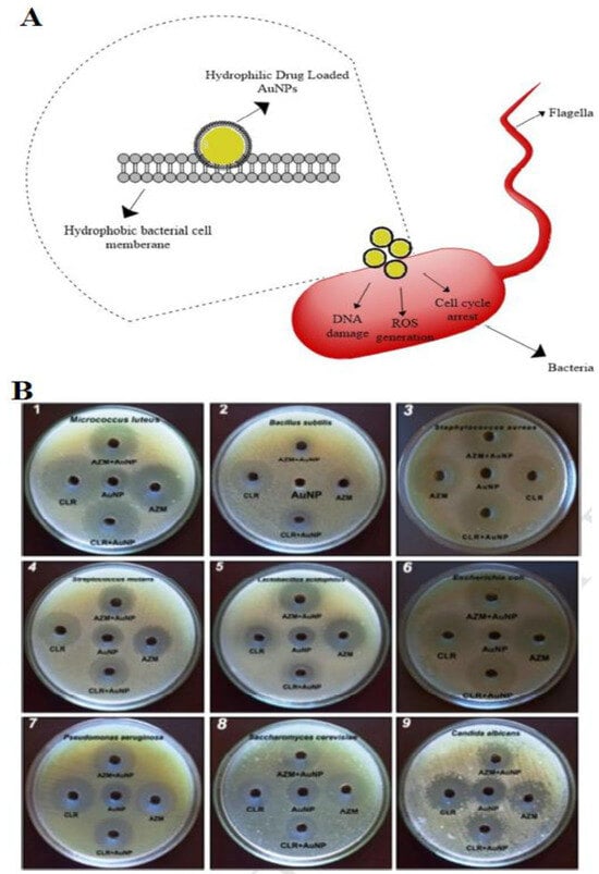 In general, about 70 fungi and bacteria are described to be related to oral disease. Au NPs with a size of approximately 30 nm synthesized by green assay through Justicia glauca, displays an antagonistic outcome with Clarithromycin and Azithromycin antibiotics in contradiction of oral pathogenic bacteria and fungi, such as Streptococcus mutans, Bacillus subtilis, Staphylococcus aureus, Saccharomyces cerevisiae, Lactobacillus acidophilus, and E. coli. The Au NPs and drug conjugated Au NPs exhibited possible antimicrobial action against the oral pathogens. Minimum Inhibitory Concentration (MIC) principles of Au NPs were detected in the range of about 6–25 µg/mL against oral pathogens. Bacterial cell membranes have hydrophobic properties that prepared glycoproteins and phospholipids may help drug-loaded Au NPs transfer through the membrane. In fact, the interaction of NPs with bacteria can inhibit the growth of bacteria through the growth signaling pathway. These green synthesized Au NPs show the high efficiency of anti-microbial activity of NPs in AMR (Figure 4A) [,,,].