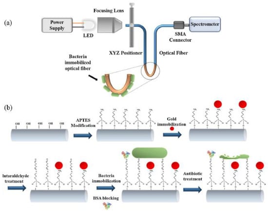 Au NPs have been recognized as outstanding properties in LSPR biosensors according to the spectral response to the NPs surface, and the simplicity of observing the signal of light according to their absorption and durable scattering []. An optical fiber biosensor based on LSPR for the capture of P. aeruginosa and E. coli monitored by antibiotic refereed lysis has been revealed in rapid drug susceptibility testing. P. aeruginosa RS1 may be sensitive to the third generation of ceftazidime, cephalosporins, and cefotaxime. P. aeruginosa can be immobilized on Au NPs in the quantification of cephalosporins with a range of 0.01–1 μg/mL and LOD was established to be 0.5 μg/mL in human serum. This biosensor can act as a substitute to mass spectrometry and chromatography methods for the cheap and rapid detection of antibiotics using the optical properties of Au NPs (Figure 5) [].