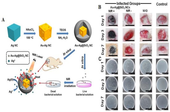 Schematic illustration of the Silica-coated Au-Ag nanocages displays antibacterial activity through photothermal activity (A). Schematic of wound tissues with various treatments on three days (B). Photographs of bacterial colonies from tissues of various treatment groups (C) Reprinted with permission from []. Copyright 2022 American Chemical Society.