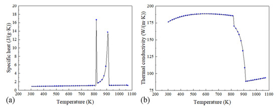 The values of specific heat (a) and thermal conductivity (b) used in this work.