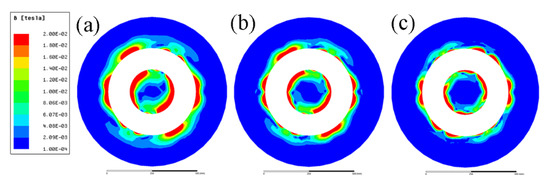 Distribution of magnetic flux density conducted with an AC frequency: (a) 5 Hz, (b) 10 Hz, and (c) 20 Hz.