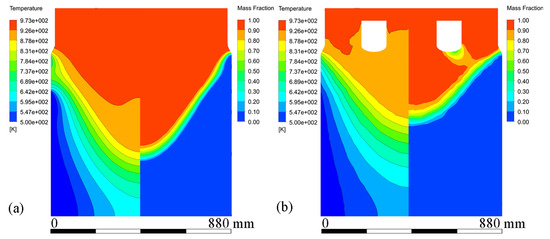 Contours of temperature profiles and mass fraction at the stable stage under both processes: (a) conventional DC casting, and (b) ICEMT.