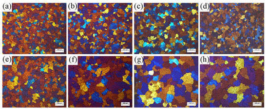 Typical grain morphologies at different positions of billets obtained under both processes: (a) ICEMT edge; (b) ICEMT 1/3 radius; (c) ICEMT 2/3 radius; (d) ICEMT center; (e) conventional edge; (f) conventional 1/3 radius; (g) conventional 2/3 radius; and (h) conventional center.