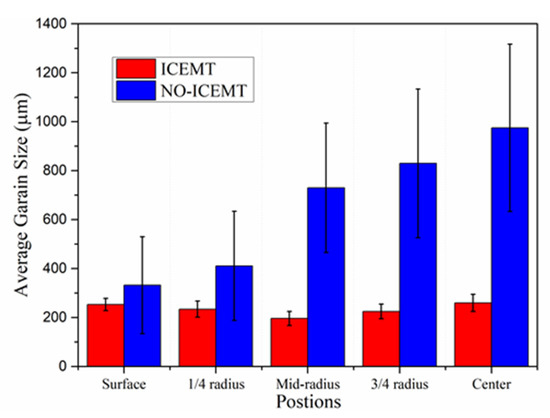 The ICEMT process can refine the grain structure of the billet significantly. Figure 8 shows the microstructures of the billet under both processes. For the normal billet, the grains are much coarser and the grain size is in the range from 150 μm to 1400 μm. It shows that the maximum grains are located in the billet center. The microstructures in the billet center are not uniform. There are a few small grains, while others mostly are large with thicker dendrite arms and large dendritic arms spacing. The structure with ICEMT mainly comprises fine equiaxed grains and is generally uniform across the cross-section of the large-sized billet. Grains are in the range of 100~300 μm in the average grain size, much smaller than that of a conventional billet. Figure 9 provides quantitative information on the average grain size at the different positions under both processes and shows that the billet without ICEMT produces much larger grains as compared with the one with ICEMT. The application of ICEMT vastly reduced the average grain size at the center and periphery for the billet with ICEMT. In addition, it also seems to homogenize the grain structure at the same position, as indicated in the big reduction in the error bars on the average grain size measurements.