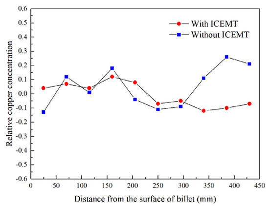 Experimental concentration profiles for copper on the cross section of the billet with and without the ICEMT process are given in Figure 10. The relative copper concentration, ΔC, is defined as the equation as follows [30]:
