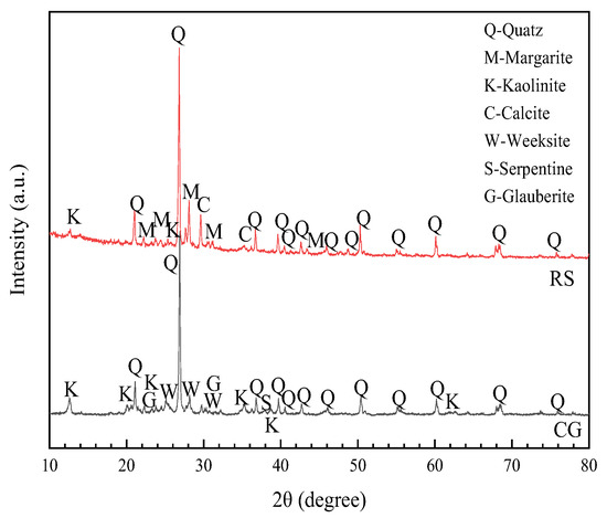 The XRD (XRD-7000, Shimadzu, Kyoto, Japan) test results for the RS and CG are shown in Figure 2. The RS was mainly composed of quartz, margarite, kaolinite, and calcite. The material composition of the CG was similar to that of the RS, with both having quartz as the main component. Compared with the RS, the main material composition of the CG contained a large amount of kaolinite, which is a characteristic component of CG. Kaolinite is rich in Al2O3, so CG provides a certain amount of active component (Al2O3) for cement mortar, which can be hydrated with cement to produce ettringite.