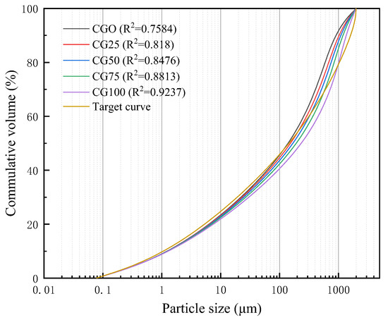 The particle size distribution of dry mixtures with CG at different replacement ratios is shown in Figure 4. The target curve was calculated according to Equation (1), in which the minimum particle size of the SF, Dmin, was 0.0215 μm; and the maximum particle size of the RS and CG, Dmax, was 2000 μm. The curves of the other five dry mixtures were obtained by sieving the dry mixtures to the required particle size. A high coefficient of determination (R2) was related to a high packing density of the dry mixtures. The coefficients of determination for CG0, CG25, CG50, CG75, and CG100 were 0.7584, 0.818, 0.8476, 0.8813, and 0.9237, respectively, and increased gradually with increasing replacement ratios of CG, achieving the maximum value at a 100% replacement ratio.