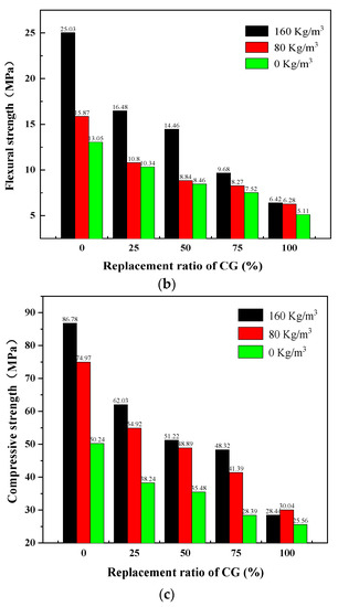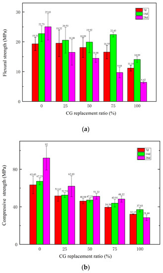 The flexural and compressive strengths of the specimens with CG at different replacement ratios on days 7, 14, and 28 are shown in Figure 6.
