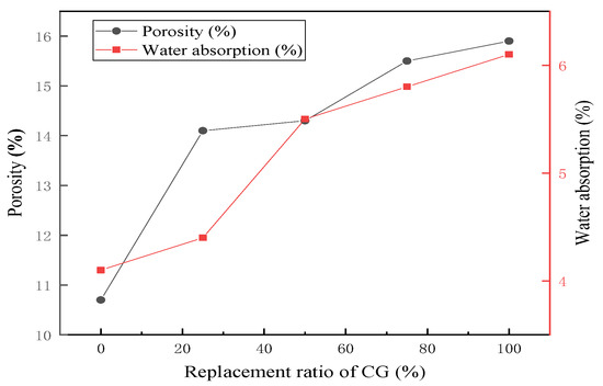 Water absorption and porosity of specimens with different CG replacement ratios.