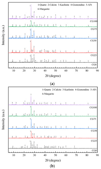 In the CG100, hydration products on days 7 and 28 had hardly changed, because the hydration reaction in the early stage consumed a large amount of water, resulting in insufficient hydration reaction in the later stage. In terms of the microstructure of hydration products, as shown in Figure 11, for CG0, a large amount of hydration products, such as fibrous C-H-S and needlelike and columnar Aft, were crosslinked and filled in the pores, thereby forming a skeleton network system. With the increase in the CG replacement ratio, the skeleton network system became sparse, and a relatively lower amount of the needlelike material appeared [23,24]. From day 7 to day 28, the diffraction peaks for quartz at all angles under the same CG replacement ratio were significantly enhanced, and the peak width in the diffraction pattern of the mortar was decreased, because the new quartz crystal had a smaller width than the original, which was conducive to the increase in the strength of mortar. The diffraction peak for kaolinite in the CG had no significant change in quantity in the diffraction pattern of the mortar at each CG replacement ratio; however, the diffraction intensity was slightly increased, which indicated that kaolinite participated in the hydration reaction to generate partially hydrated kaolin, which could be the cause of the back shrinkage of the strength of the samples.