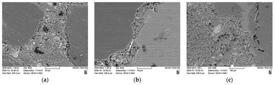 The ITZ was the weakest structural region in the concrete. Figure 12 shows the ITZ around the RS and CG of the CG0, CG50, and CG100 on day 28. When the fine aggregate was RS, its polygonal shape helped it to be tightly wrapped by the cement matrix, with almost no cracks around it, and the cement matrix was relatively compact. With the increase in the CG replacement ratio, the cement matrix was still tightly wrapped the aggregate, with no obvious change and almost no cracks around it. However, when the aggregate was CG, the cement matrix became significantly looser, and the aggregate wrapped by the cement matrix was less dense. Cracks could be clearly seen, and the interface was not complete and was broken. This affected the strength from a macro perspective. As the CG replacement rate increased, owing to the low density of the CG, the surface area of the CG increased and part of the CG was exposed, resulting in a sharp decrease in the mechanical strength. The hydration product Ca(HO)2 in the white area and the bubbles in the black area in the figure can be observed: with the increase in the CG replacement rate, the number of hydration products and bubbles in the CG100 could be obviously observed to decrease. This showed that the cement matrix was relatively loose, and the CG inhibited the hydration reaction, causing ring breakage in the interface structure to a certain extent [25,26].