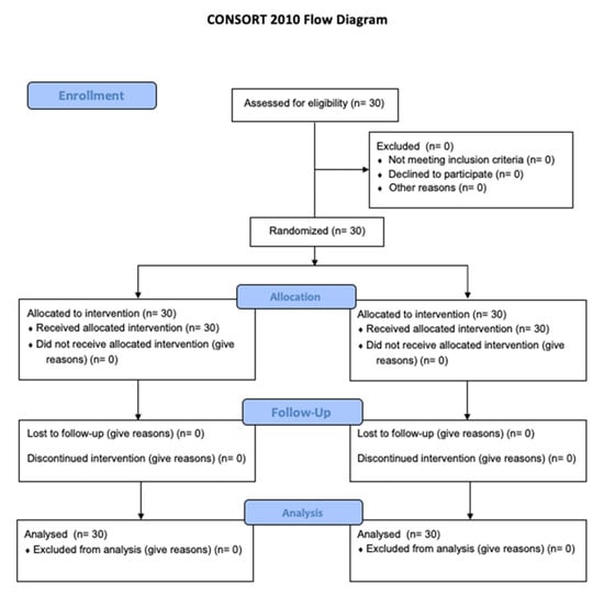 - Schulz, K.F.; Altman, D.G.; Moher, D.; Group, C. CONSORT 2010 Statement: Updated guidelines for reporting parallel group randomised trials. Trials 2010, 11, 32. [Google Scholar] [CrossRef] [Green Version]