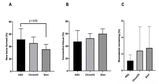 Graphic showing the histomorphometric outcomes for new bone formation (A), connective tissue (B), and biomaterial remaining (C) after 6 months in the human maxillary sinus augmented with the three bone substitutes studied.