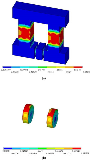 The main components of the selected MRE are 15% rubber, 15% silicone oil and 70% hydroxy iron powder [50]. Among them, rubber is used as the base material, silicone oil is used to mix iron powder into liquid rubber, and hydroxyl iron powder is used for magnetic particles, due to its high magnetism efficiency at a high frequency [51]. We used ANSYS to complete the FATMD three-dimensional modelling and magnetic circuit analysis. Figure 3 shows the ANSYS magnetic circuit analysis cloud diagram under 2 A current. The magnetic induction of the iron core of the magnetic circuit is the largest, followed by the MRE, and the magnetic induction distribution in the MRE region is relatively uniform, with an average value of 0.647 T.