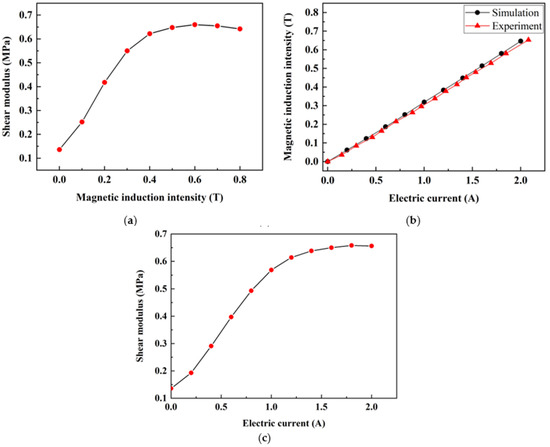 Relationship between material properties in MRE: (a) Magnetic induction and shear modulus of MRE; (b) Current and magnetic induction; (c) Current and shear modulus.