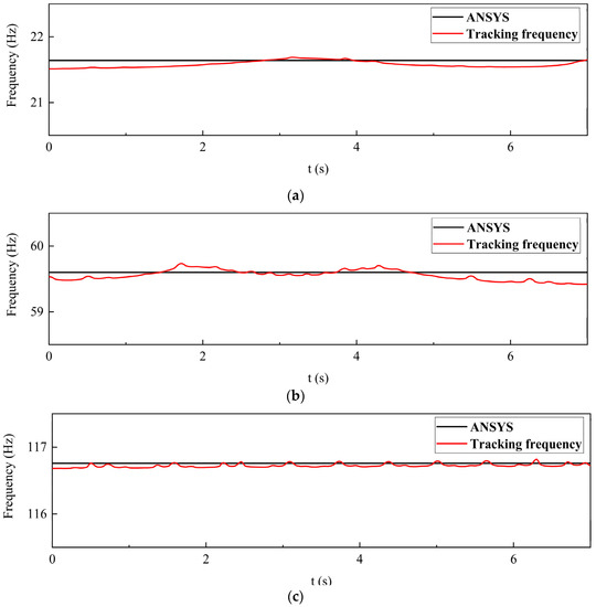 Through ANSYS finite element analysis, the first three natural frequencies of the steel beam structure were 21.64 Hz, 59.60 Hz, and 116.76 Hz. The frequency identification method introduced in Section 3.3 was used to intercept the acceleration response signal within 7 s, to identify the natural frequency of the system. Figure 6 shows the comparison result of the identification frequency and the frequency obtained from ANSYS analysis, which indicates a good agreement.