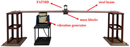 To verify the vibration reduction effect of FATMD, we built a vibration control experiment platform, as shown in Figure 7. In the experiment, the natural frequency of the steel beam is adjusted by changing the number of mass blocks in the middle of the steel beam, which is used to simulate the change of the natural frequency of the main structure. FATMD is placed in the middle of the steel beam to control the first-order modal vibration of the structure.