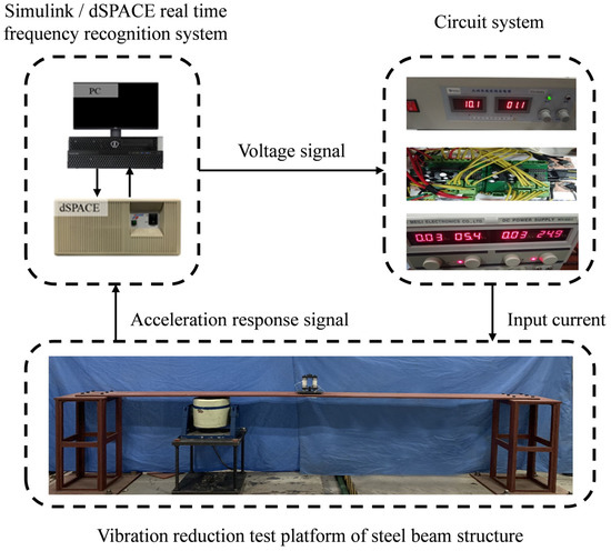 The parameters of FATMD are shown in Table 2, in which MRE is a cylindrical block, with a cross-sectional area of 33 mm2 and a thickness of 3 mm. The working process of the FATMD vibration reduction experiment system is shown in Figure 8. The frequency tracking system in the experiment consists of Simulink/dSPACE and a circuit system. The circuit system is composed of a high-voltage source and a low-voltage source, respectively, connected to the FATMD coil and the dSPACE output. The principle is as follows.