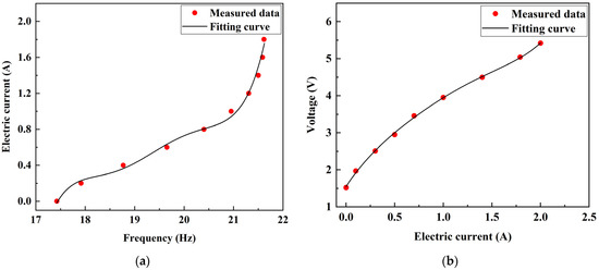 We obtained the function relationship between frequency and current, current and voltage, through the measured data of current and voltage in the circuit system, as shown in Figure 9. The relationship between input voltage and FATMD natural frequency is shown in Equation (27).