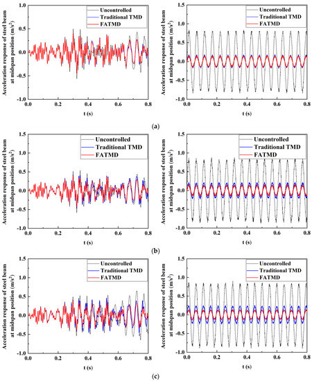 - TMD is replaced by FATMD. Apply voltage to FATMD through the calculation frequency of the main structure, using Equation (27). Then, record the mid-span acceleration response under the two excitation methods;