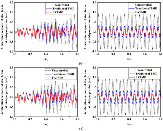 The acceleration response curves of the steel beam under different cases are as shown in Figure 10. In each subfigure, the case of white noise excitation is on the left and that of natural frequency excitation is on the right. It can be seen that in the steady-state response stage of the system, when the external excitation is white noise, the acceleration of the FATMD vibration reduction system remains at about 0.4 m/s2 with the gradual decrease in the number of mass blocks. The minimum and maximum vibration reduction ratios of peak acceleration are 21.83% and 49.73%, respectively, which are significantly better than those of the traditional TMD vibration reduction system. Similarly, when the external excitation is harmonic excitation, and the peak acceleration of the FATMD vibration reduction system is always maintained at about 0.1 m/s2 with the reduction in the number of mass blocks. However, the peak acceleration of the traditional TMD vibration reduction system is increased from 0.19 m/s2 to 0.35 m/s2. It indicates that FATMD can adapt to the frequency changes of the main structure and maintain the optimum vibration reduction effect.