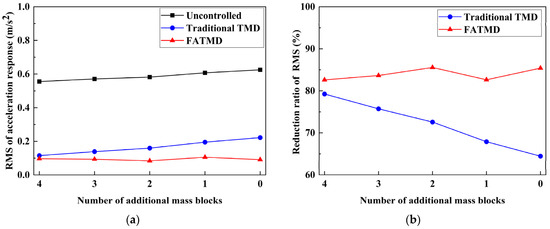 In order to show more clearly that the traditional TMD is more sensitive to the change of the natural frequency of the main structure and highlight the advantages of FATMD, we calculated the RMS and its reduction of the mid-span acceleration response of the steel beam without control, with TMD and with FATMD, under harmonic excitation, as shown in Figure 11. It was found that under harmonic excitation, as the number of additional mass blocks decreases, the acceleration response, RMS of FATMD, is basically maintained at about 0.1 m/s2, and the vibration reduction ratio is between 82.61% and 85.56%, which appears to be steady. The trend is due to the frequency tracking method, which can be used to observe the natural frequency of the main structure in real time, so as to ensure that FATMD is always in the optimal tuning state. The acceleration response, RMS, of the traditional TMD increased from 0.12 m/s2 to 0.22 m/s2, and the vibration reduction ratio decreased from 79.24% to 64.45%. The vibration reduction ratio continues to decrease, which indicates that the natural frequency of the steel beam changes when the number of mass blocks is reduced. That is, when the natural frequency of the main structure changes, the traditional TMD appears to be detuning. Therefore, FATMD can obtain a stable and good vibration reduction effect in a wide frequency band, and its vibration reduction performance is significantly better than that of traditional TMD.