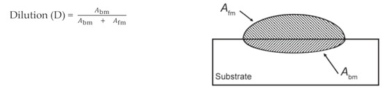 The DSS-CRA weld overlay works well with low-alloy or high-tensile carbon steel depending on the extent of dilution [15]. In cladding or weld overlay applications, the dilution effect needs to be kept at a minimum to maintain the original alloy elements and to ensure the cladding retains its corrosion and wear resistance [16]. The concept of dilution is shown in the schematic illustration of Figure 1. The weld overlay alloying elements in the fusion zone are affected by the concentration and the dilution of chemical elements in the area of the weld metal () and the base metal area ().