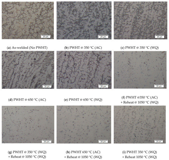 In this research work, isothermal heat treatments in the range 350–1050 °C for various holding times and different cooling rates have been applied on duplex stainless steel weld overlays to study the kinetic of alpha embrittlement, carbide, chromium nitride, chi and sigma phase precipitation. Figure 3a–i show the micrograph of cross sections of the weld metals which present an austenite-ferrite phase microstructure. Sample No. 1 (as welded), shown in Figure 3a, revealed two phase microstructures in the austenite-ferritic matrix, where it can be observed that the amount of austenite phase formation was greater that of ferrite phase which was indicated by a higher pitting corrosion resistance. Samples No. 2 and 3 (Figure 3b,c) had undergone PWHT at 350 °C and indicated that the grain boundary austenite (GBA) and widmanstatten austenite (WA) had slightly decreased. Samples No. 4 and 5 showed that the volume fraction of ferrite was slightly deceased in the weld metal as shown in Figure 3d,e, which might be due to lots of precipitated ferrite phase that was dissolved into the gamma (γ) phase. By increasing the solution anneal temperature to 1050 °C, numerous intra-granular austenite grains structures were revealed, whereas the amount ferrite phases were further reduced. The micrographs in Figure 3f,i depict that austenite grains did not show any favorable growth direction. The indications have shown that the entire contents of austenite in weld metal and heat affected zone are increased after conducting solution annealing treatment followed by rapid quenching in water in order to avoid the sensitizing temperature zone varying from 800 °C to 500 °C.
