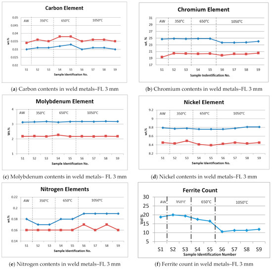 This is a main chemical component that confers pitting corrosion resistance protection to steels with a minimum content of 20 wt.%. It also promotes ferrite phase formation and increases the strength in solid solution, however an extremely high content can result in low ductility and inferior toughness. The as-welded sample showed chromium contents ranging from 20.33 wt.% to 24.67 wt.%. PWHT samples No. 2 to 5 showed a slightly high chromium content in between 20.34 wt.% and 24.87 wt.%, respectively, because of the higher temperature of the heat treatment and the aging time that could cause the chromium content in the Fe-rich phase to progressively increase during the ferrite decomposition. However, the selected PWHT samples No. 6 to 9 were subjected to a reheating process at solid solution temperature (1050 °C) with 2-h soaking time and immediately quenched with water. The results showed consistently low chromium content at 19.88 wt.% and 23.68 wt.% as indicated in Figure 5b, which was due to the solid-state phase transformation from austenite to alpha (α) ferrite, the higher volume fraction of ferrite prevents the chromium and molybdenum from spreading over a greater region and becoming diluted. It has also been reported by Guo et al. [17] that the content of chromium decreased in the ferrite phase and slightly improved in the austenite phase, with the same solution annealing temperature.